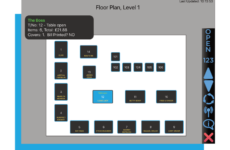 PocketTouch offers easy to navigate precision control of its floor plan. Assign names to tables, so the waiting staff can provide a personal level of customer service.Highlight a table to see its current status, including table open/closed, total, items, and if the bill has been printed.The multi-level floorplan enables the customer to sit wherever they like and be found by the waiting staff, even if it's in the beer garden. Then, if they move, simply transfer the bill to another table.